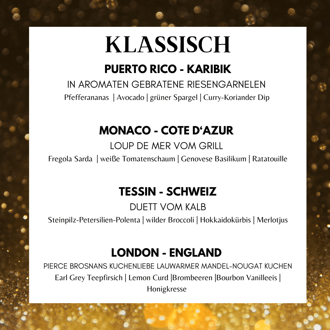 Ein Vier-Gänge-Gourmetmenü von Sternekoch Martin Scharff sorgt dafür, dass auch kulinarisch keine Wünsche offenbleiben. Feinste Zutaten, raffiniert inszeniert und mit internationalem Flair, machen das Menü zu einem Erlebnis für die Sinne. Begleitet wird der Abend von prickelndem Champagner von Nicolas Feuillatte, der den Glanz und die Eleganz eines Bond-Abenteuers perfekt abrundet.