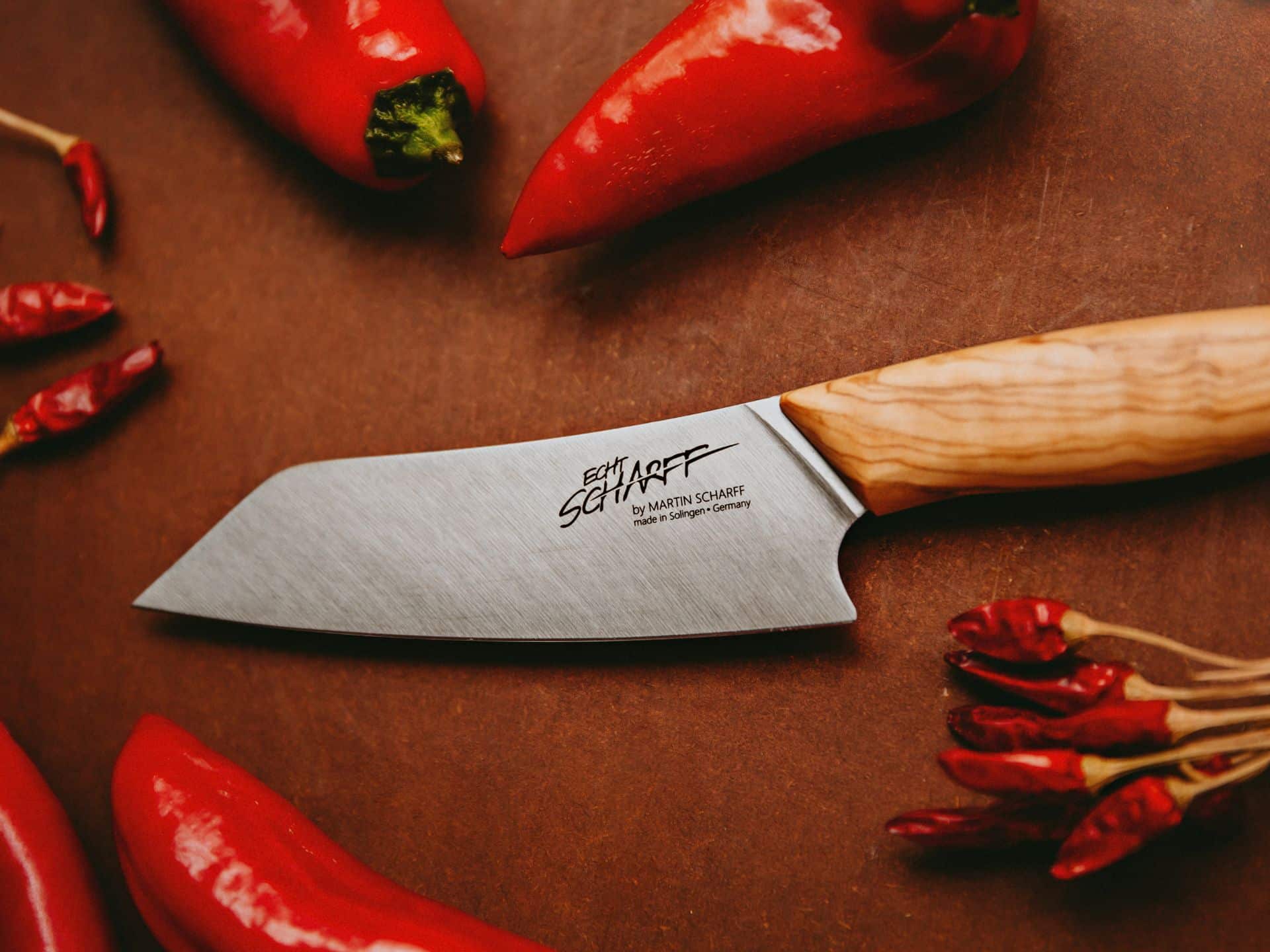 Durch die gewählte Griffergonomie liegt es sehr gut in der Hand. So ist ein unkompliziertes Schneiden oder Wiegen der Klinge möglich. Das Griffholz macht es zu einem wahren Handschmeichler. Das Design ist elegant, schwungvoll und zeitlos gewählt. Durch den speziell ausgewählten schwedischen Stahl hält es die Schärfe sehr lange, das Messer lässt sich gegenüber dem typischen Solinger Klingenstahl leichter nachschärfen. Der Messerrücken wurde verrundet. Das ermöglicht ein langes, ermüdungsfreies und angenehmes Schneiden, während der integrierte Fingerschutz für eine hohes Maß an Sicherheit sorgt.