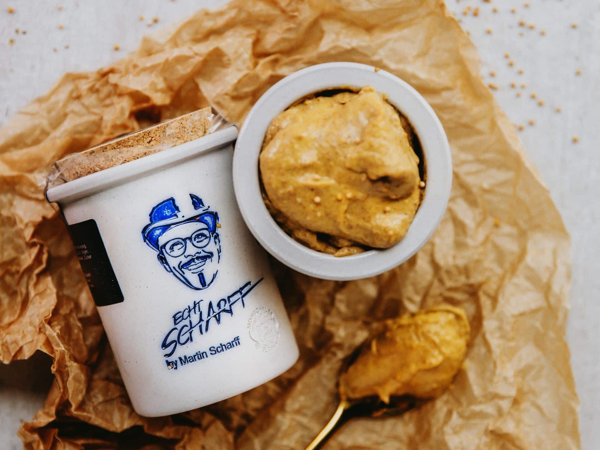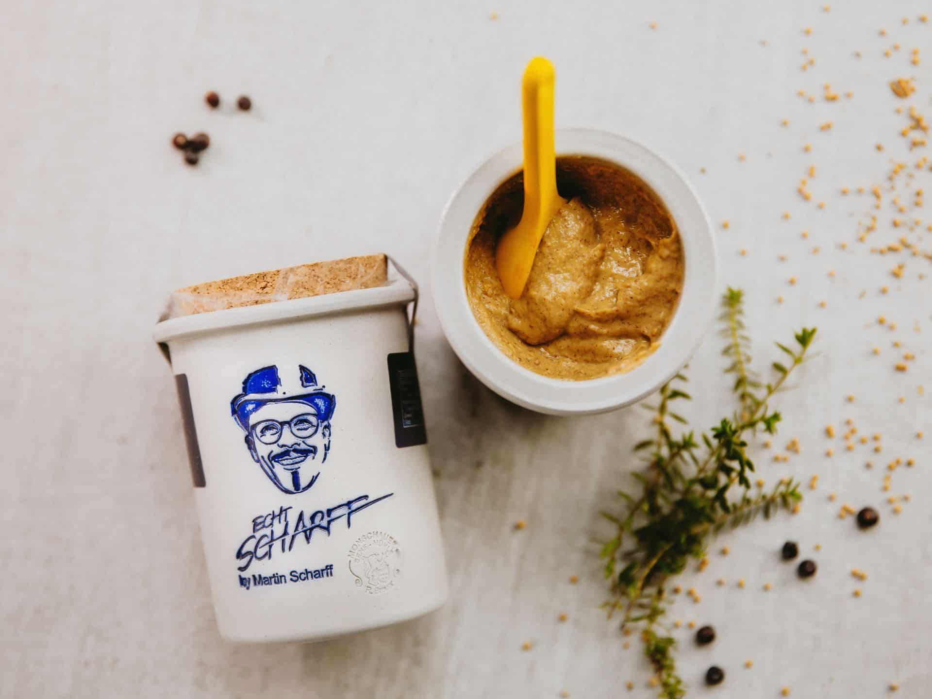 ECHT SCHARFF, aber nicht scharf: Ein wahres Multitalent ist der Senf „Honig-Mohn”. Eine harmonische, süßlich-würzige Senfkreation, die ganz klar Martin Scharffs Empfehlung trägt. In Kooperation mit der Senfmühle Monschau ist die exklusive Edition des Honig-Mohn-Senfs im 200ml-Tontöpfchen entstanden. Als Saucensenf ist er nahezu überall einsetzbar und schmeckt hervorragend zu Lachs, als Beilage zur Weißwurst und Kassler und ist unentbehrlich in Salatsaucen. Er belebt Wildmarinaden und betont delikate Salat-, Fleisch-, Fisch- und Geflügelsaucen.