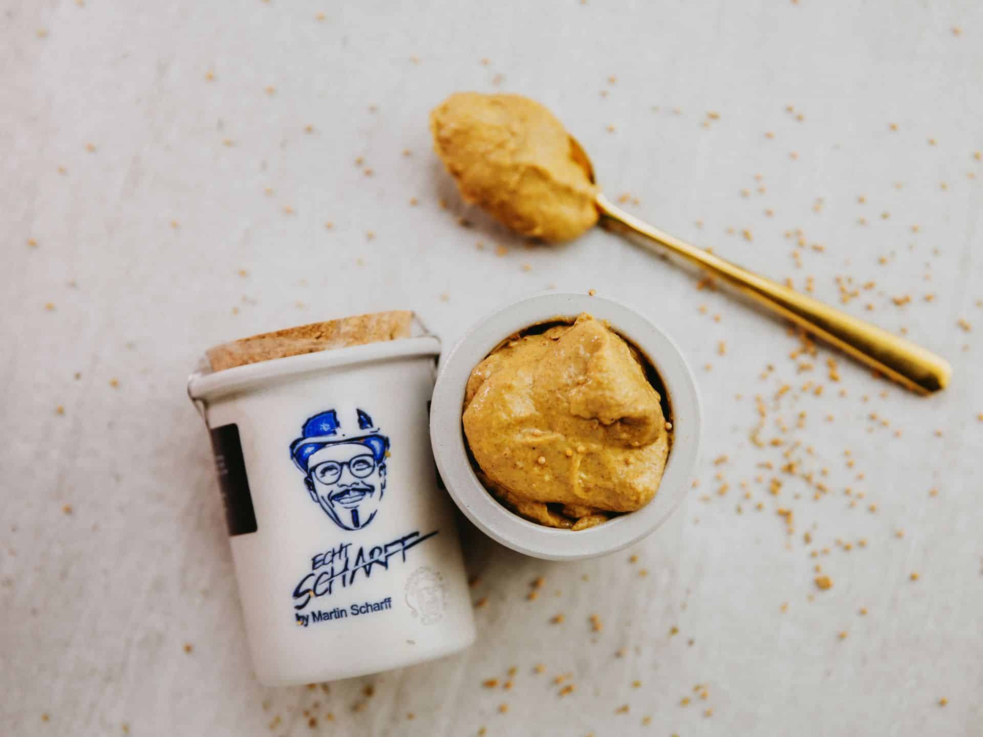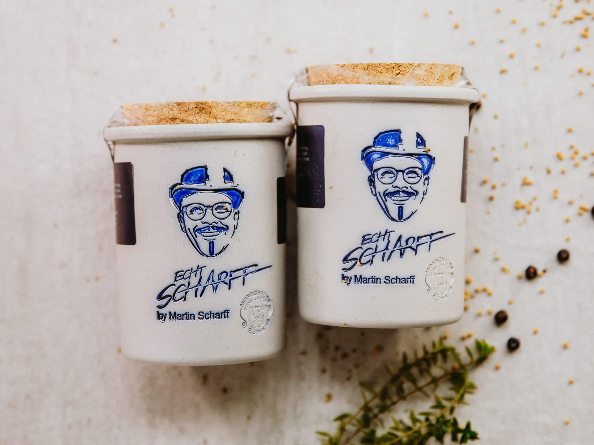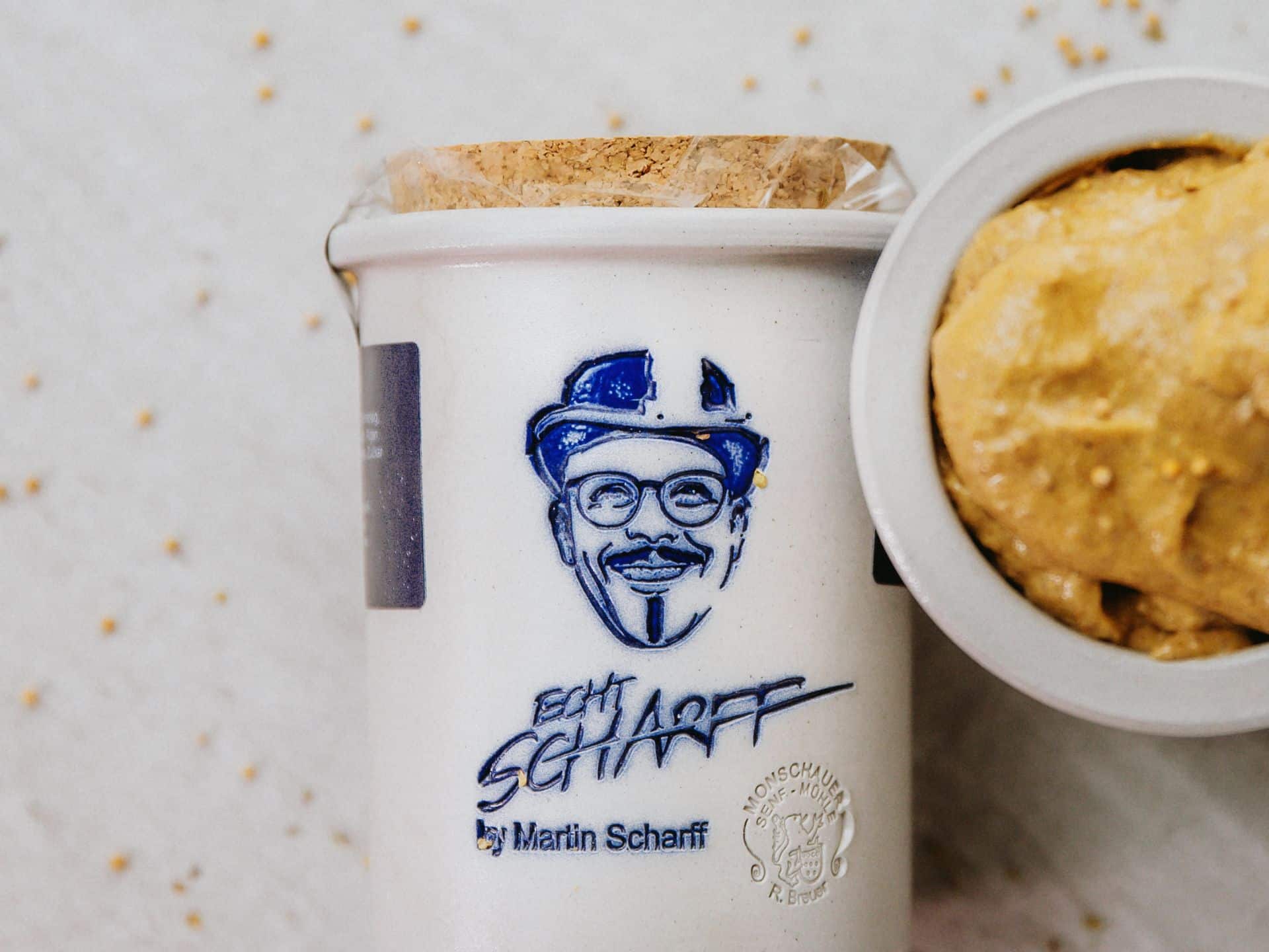 ECHT SCHARFF: Dieser mittelscharfe Basissenf, den Martin Scharff aufgrund seines scharf-würzigen Aromas zu allen Speisen empfiehlt, wird in traditioneller Handwerkskunst in der Senfmühle Monschau hergestellt. Die Senfkörner werden steinvermahlen, so dass die ätherischen Öle erhalten bleiben. Der erlesene Senf besteht zu 60% aus Urkräutersenf nach Urrezept und zu 40% aus Biokräutersenf  – ein kulinarischer Genuss!